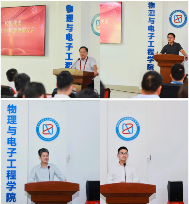 校友代表物理1984级罗伟群、电子1998级刘金表、电子2001级龙洲分别发言。他们回忆了当年在母校的学习和生活,为母校和母院的发展变化深感骄傲和欣慰。他们也分享了自己的工作和创业经历,鼓励师弟师妹努力学习,勇于创新,开拓进取,为国家和社会作出贡献。教师代表邓定南老师表达了学院广大教育工作者对教育事业的热爱和责任感,强调教书育人的初心和使命,老师们将不断提高教学和科研水平,致力于培养更多优秀的人才,推动学院高质量发展。