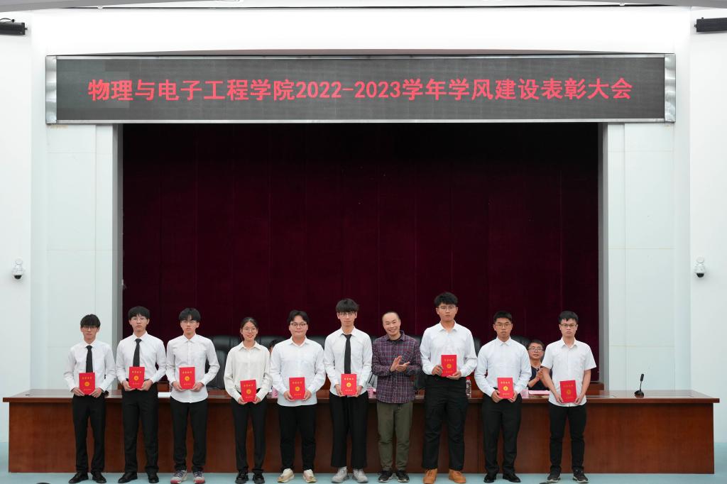 钟庆湖宣读了《物电学院关于2022-2023学年学风建设表彰决定》,院领导分别为先进班主任、先进班集体、国家奖学金、国家励志奖学金、第三届物电之光年度人物、各项国家省市级学科竞赛获奖集体及个人颁发奖状和证书。