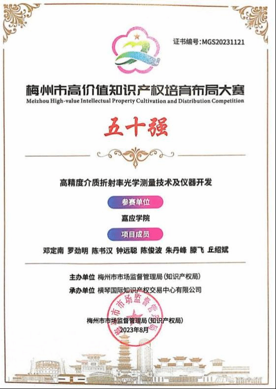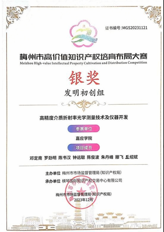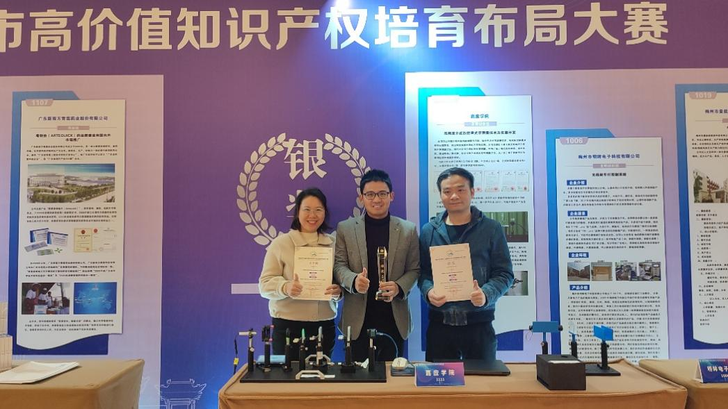 12月22日,首届梅州市高价值知识产权培育布局大赛(简称“梅高赛”)举行颁奖大会。我院邓定南博士团队项目《高精度介质折射率光学测量技术及仪器开发》荣获发明初创组银奖,也是学校荣获高价值知识产权培育类竞赛的首个奖项。