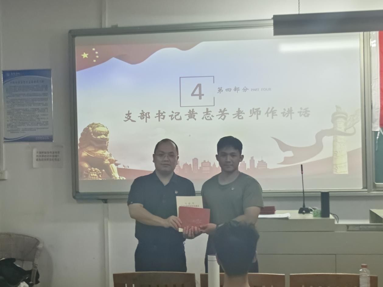 组织员黄老师围绕“习近平总书记关于加强党的作风建设的重要论述、学习领会和贯彻落实中央八项规定及其实施细则精神、激励新时代青年在中国式现代化建设中挺膺担当”等三方面为毕业生党员开展专题学习,为每一位毕业生党员发放政治生日贺卡、党员徽章和《习近平关于加强党的作风建设论述摘编》书籍。毕业生党员代表发言表态,全体毕业生党员将始终牢记入党誓词,在新的学习和工作岗位上继续发挥先锋模范作用,以实际行动践行共产党员的初心与使命。全体党员重温入党誓词,牢记党员身份,坚定理想信念、永葆廉洁自律本色。