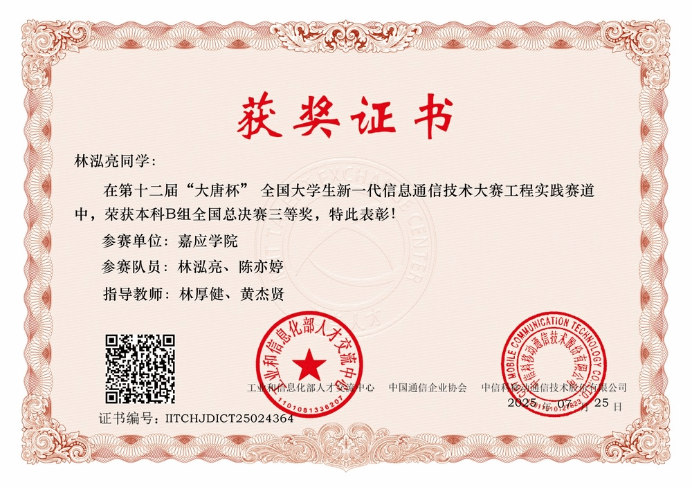 近日,第十二届"大唐杯"全国大学生新一代信息通信技术大赛全国总决赛在武汉理工大学圆满落幕。我院学子在工程实践赛本科B组赛事中表现优异,由林厚健、黄杰贤老师指导的林泓亮、陈亦婷同学凭借扎实的专业功底与出色的实践能力,从全国数千支参赛队伍中脱颖而出,荣获国家三等奖(本科组)。此前在省级赛事中,该团队已以广东赛区一等奖的优异成绩晋级全国总决赛。