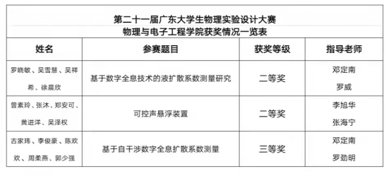 2020年11月28日和29日由广东省物理学会主办、广州大学承办的第二十一届广东大学生物理实验设计大赛在广州大学大学城校区举办。此次决赛我院选拔的3支队伍参加了比赛,荣获了基础题组二等奖、三等奖各1项,应用题组二等奖1项的好成绩。