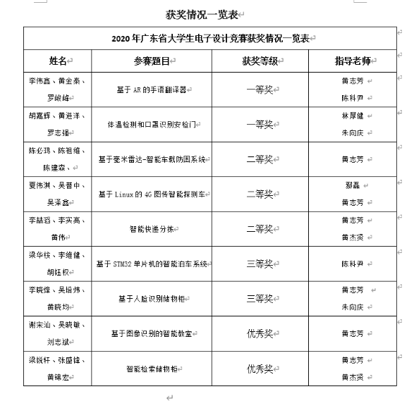 日前,由广东省教育厅主办、华南理工大学承办的“5G-AI”专题2020年广东省大学生电子设计竞赛在佛山举行。我校yl6809永利官网集团选拔的9支队伍参加了比赛,师生同心协力,在比赛中荣获一等奖2项,二等奖3项,三等奖2项的好成绩,获奖等级和获奖数量位居同层次院校前列。