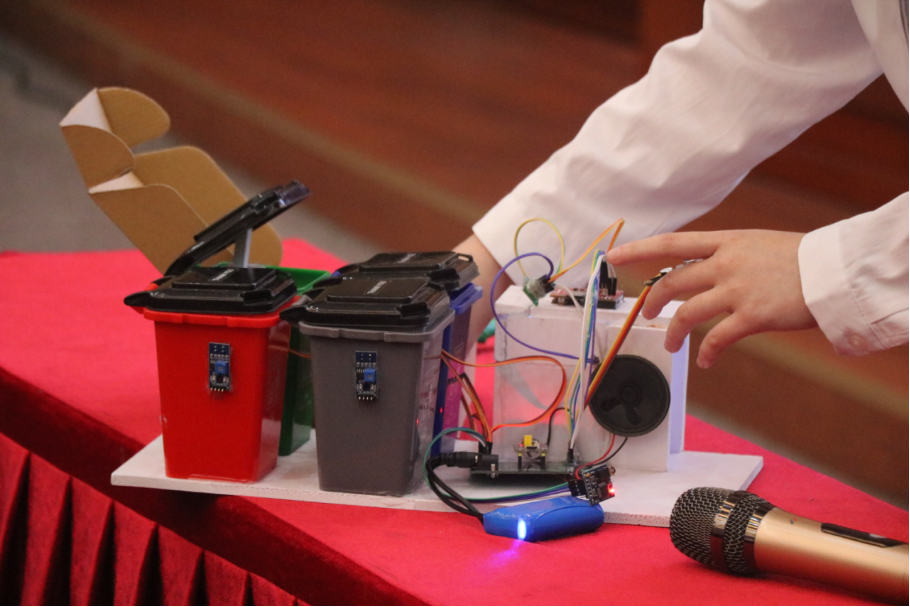 比赛包括讲解PPT和视频、实物操作三个环节,每组参赛选手通过作品实物展示、PPT及视频依次对自己作品进行讲解。面对评委提出的问题,选手们沉着冷静、清晰详细地回答问题。评委们现场评判和打分,并对每一件作品给出了修改完善意见。经评比后,获得一等奖的队伍是有手就行队的《基于arduino的体感机械手》、3.3伏皮卡丘队的《无人售卖车》;获得二等奖的队伍是掉发小队的《基于STM32的智能头盔》、上天揽月队的《基于esp32和微信小程序的宠物喂食装置》、你说的都队的《厨房安全检测系统》;获得三等奖的队伍是做得都队的《基于图像识别与语音识别的智能分类垃圾箱》、千机轻工队的《基于YOLOv7图像识别的自动分拣系统》、正点牛子队的《语音控制智能家居》、再熬夜就猝死队的《智能垃圾车》、我们队的《基于51单片机的智能小车》和如履平地队的《移动智能防疫小助手》;获得优秀奖的队伍是小白摸鱼队的《集成化智能流食器》、热火队的《快递循环接发循迹智能小车和平衡车》、河与蟹队的《儿童外出智能监管设备》、明天会更好队的《自动翻页机器》。