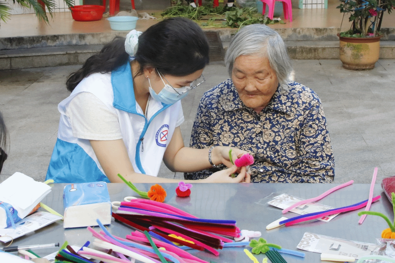 当天上午,志愿者们满怀热情抵达敬老院,为平日静谧的院区添了几分热闹与暖意。活动伊始,志愿者们有序分组投入活动,在投壶、套圈等游戏区,为老人耐心讲解玩法,老人成功投中或套中时,大家一同露出开心的笑容;扭扭棒桌前,大家一步步教老人折简单小花,长辈们举起作品展示时,现场满是温馨。活动尾声,金山街道敬老院的院长对此次志愿活动给予高度评价,肯定了志愿者们的爱心与付出。