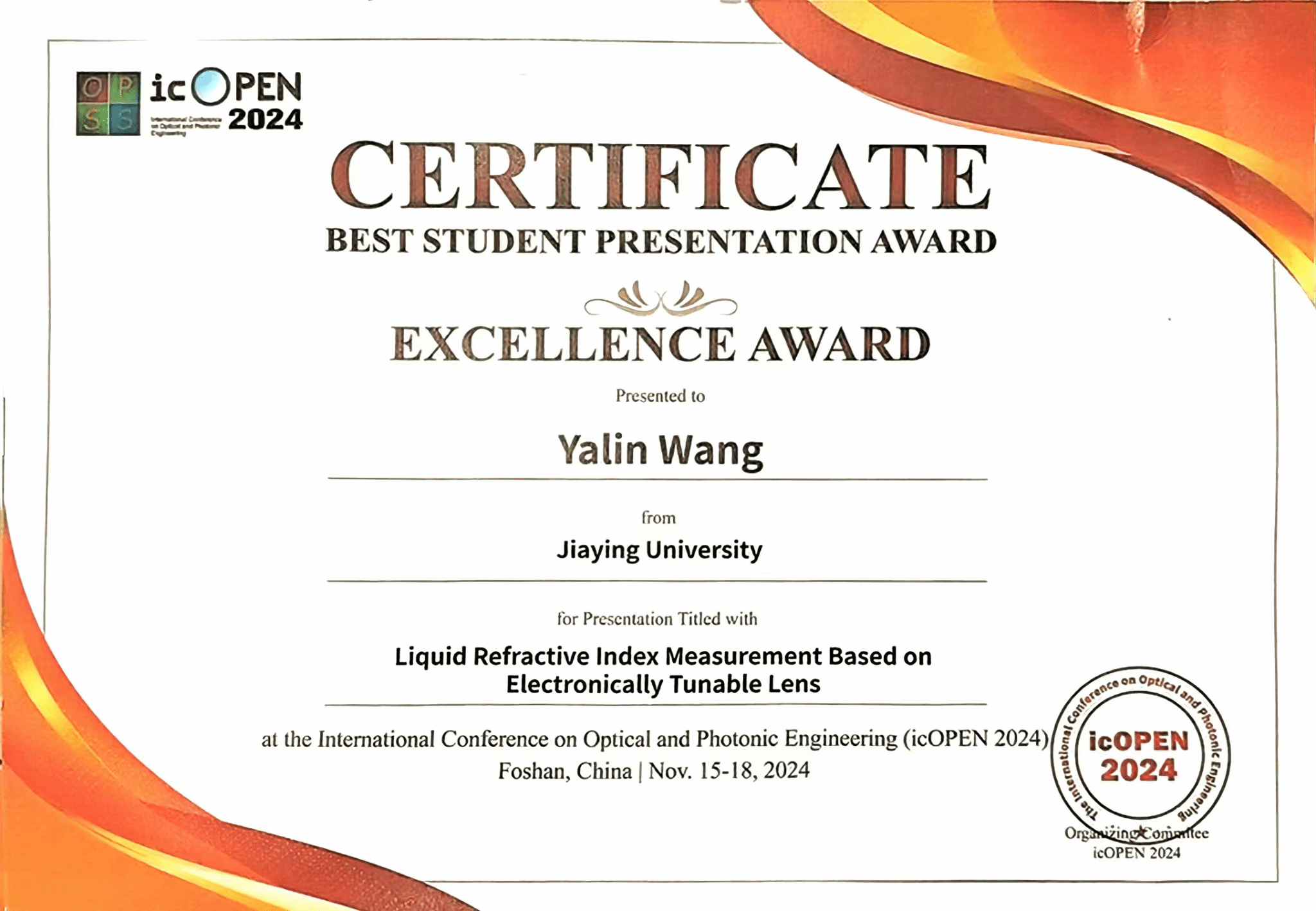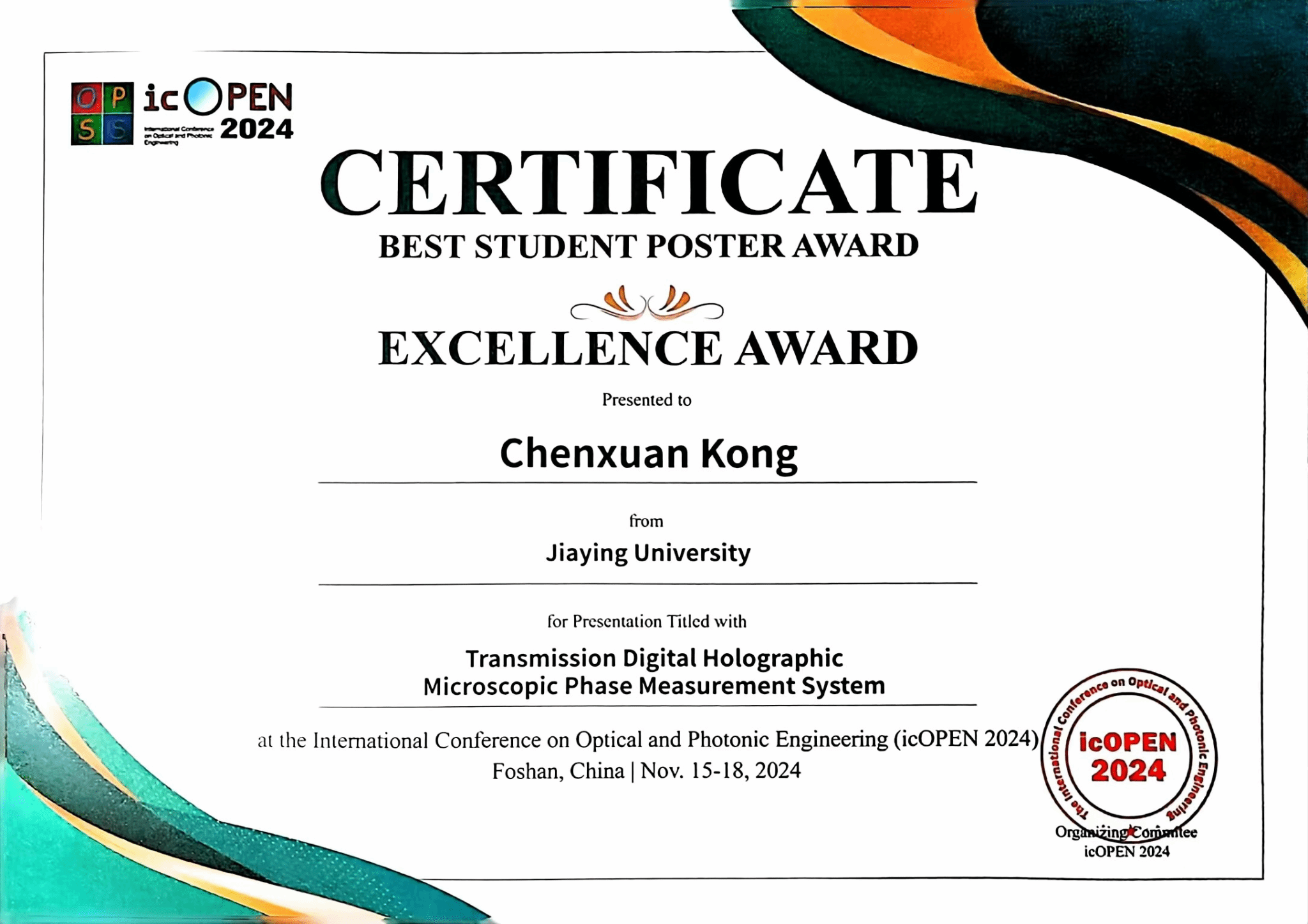 学生竞赛也是本次会议的一大亮点,王雅琳同学的研究项目《Liquid Refractive Index Measurement Based on Electronically Tunable Lens》以其精准的实验设计与前瞻性的技术应用,赢得了评委们的一致好评,而孔郴瑄同学的《Transmission Digital Holographic Microscopic Phase Measurement System》则通过深入的理论分析与创新的实践探索,展现了数字全息技术的无限可能,两人均荣获会议颁发的“卓越奖”,为学院赢得了荣誉。在竞赛现场,现场气氛如火如荼,紧张而又充满激情,展现出了极高的专业素养和创新能力。学生们在比赛中相互学习、共同进步,竞赛不仅点缀了原本严谨的学术氛围,更让整场会议变得生动而富有朝气。