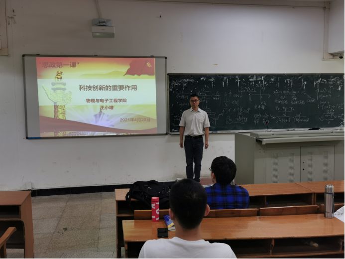 为扎实推进党史学习教育,落实立德树人根本任务,按照学校党委的要求,4月22日上午,我院院长王小增结合专业实际,以《科技创新的重要作用》为主题,在公颜实训大楼B202给电子1903班、1904班近100名学生讲授了一堂思政课。