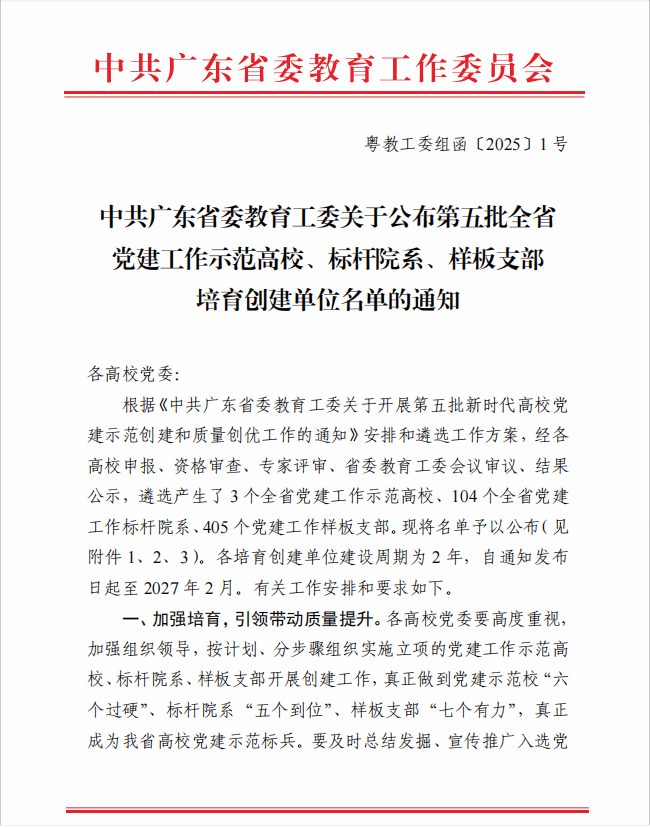 近日,中共广东省委教育工委公布了全省第五批新时代高校党建示范创建和质量创优工作评审结果,我院学生第一党支部获评全省党建工作样板支部培育创建单位。